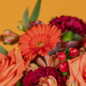 MÄnedens bukett er fylt med blomster som roser, santini og nelliker sammen med hypericumbÊr. Med sine aprikos- og klarrÞde farger er det en bukett som imponerer. Perfekt for alt du vil feire i hÞst.