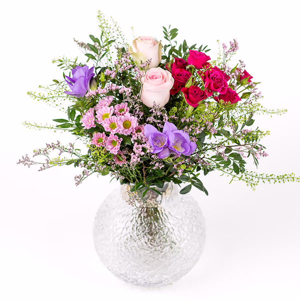 Merk at bildet viser bukettens farge og form. Blomstene kan variere avhengig av sortiment og sesong. Vase følger ikke med.